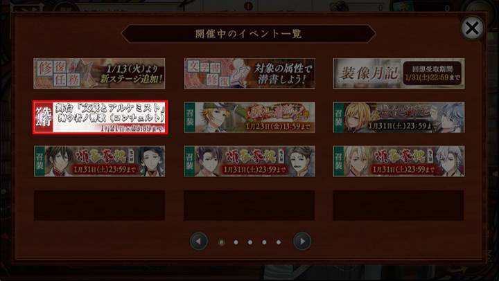 ①PCブラウザ版にて、ゲーム「文豪とアルケミスト」の図書館ページへ遷移し、バナー横の「⋮≡」を押下、